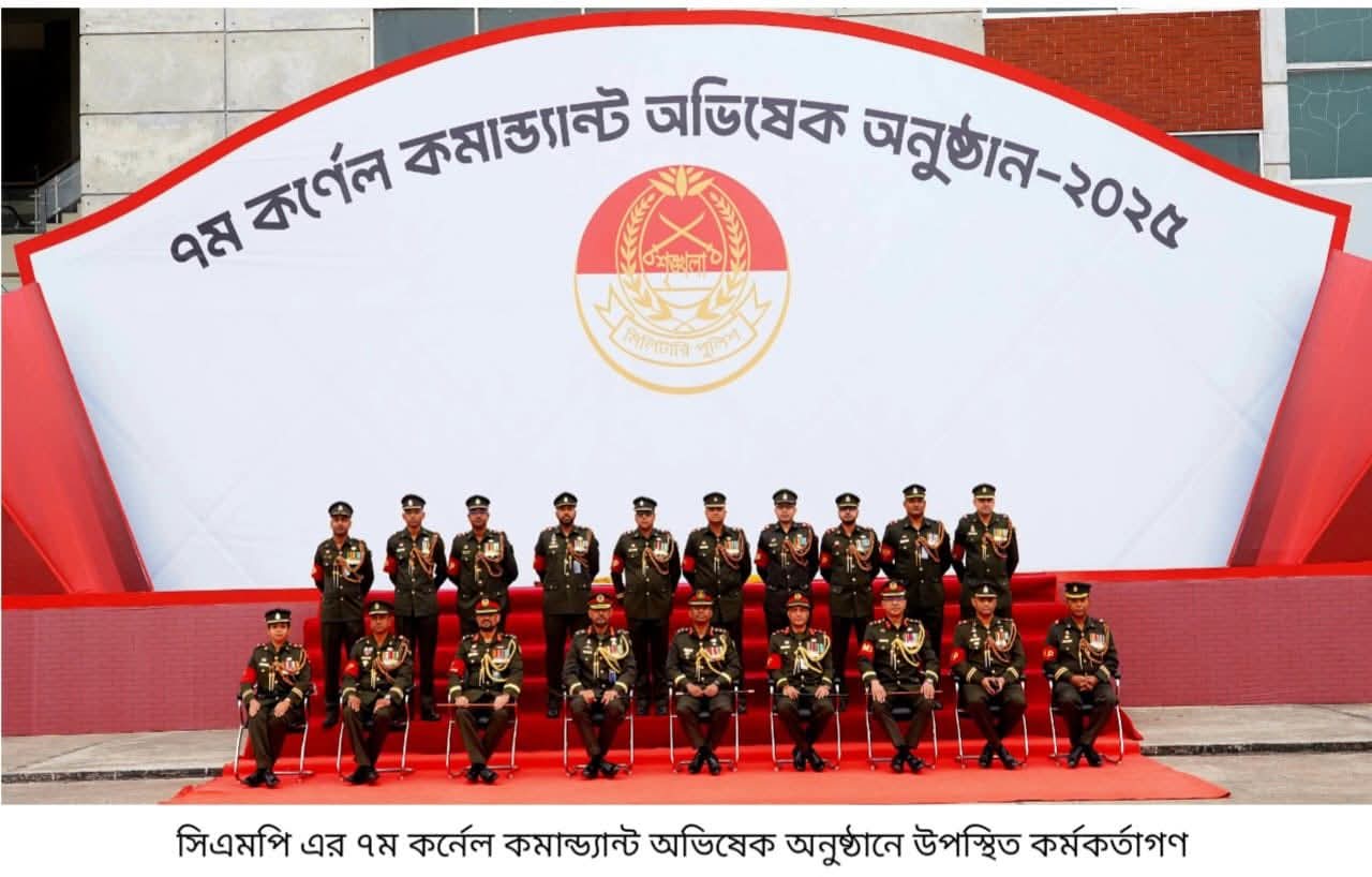ঢাকা, ২৯ ডিসেম্বর ২০২৫ (সোমবার): আজ সাভার সেনানিবাসস্থ কোর অব মিলিটারী পুলিশ সেন্টার এন্ড স্কুল (সিএমপিসিএন্ডএস)-এ কোর অব মিলিটারী পুলিশ এর ৭ম কর্নেল কমান্ড্যান্ট হিসেবে অভিষিক্ত হলেন সেনাবাহিনীর কোয়ার্টার মাস্টার জেনারেল লেঃ জেনারেল মোঃ ফয়জুর রহমান, বিএসপি, এসজিপি, এনডিসি, এএফডব্লিউসি, পিএসসি। নবনিযুক্ত কর্নেল কমান্ড্যান্ট সিএমপিসিএন্ডএস প্যারেড গ্রাউন্ডে পৌছালে তাঁকে আনুষ্ঠানিকভাবে অভিবাদন এবং গার্ড অব অনার প্রদান করা হয়। নবনিযুক্ত কর্নেল কমান্ড্যান্টকে কোর অব মিলিটারী পুলিশ এর জ্যেষ্ঠতম অধিনায়ক এবং মাস্টার ওয়ারেন্ট অফিসার ‘কর্নেল কমান্ড্যান্ট’ র্যাংক-ব্যাজ পরিয়ে দেন। বর্ণাঢ্য কুচকাওয়াজ শেষে নবনিযুক্ত কর্নেল কমান্ড্যান্ট উপস্থিত সকলের উদ্দেশ্যে তাঁর মূল্যবান বক্তব্য প্রদান করেন। তিনি তাঁর বক্তব্যে কোর অব মিলিটারী পুলিশ এর উন্নয়ন এবং এ কোরের সকল সদস্যদের পেশাদারিত্ব ও কর্মদক্ষতা উন্নয়নে সকলকে নিরলস প্রচেষ্টা চালিয়ে যাবার জন্য দিক-নির্দেশনা প্রদান করেন।