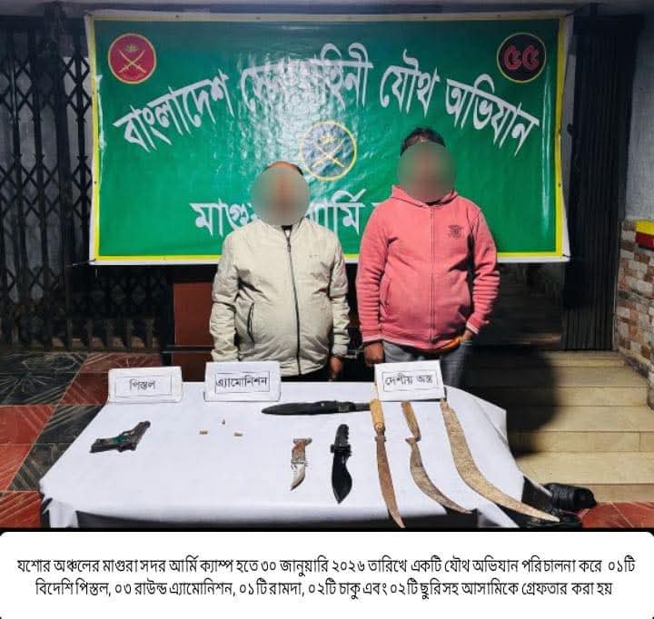 ঢাকা, ৩০ জানুয়ারি ২০২৬ (শুক্রবার): গতকাল মধ্যরাতে সুনির্দিষ্ট গোয়েন্দা তথ্যের ভিত্তিতে মাগুরা জেলার শালিখা থানাধীন আড়পাড়া গ্রামে সেনাবাহিনীর নেতৃত্বে যৌথ অভিযানে মোঃ মনিরুজ্জামান চকলেট (৪৮) এবং মোঃ নয়ন মুন্সি (৪০)কে গ্রেফতার করা হয়। অভিযানে ১টি বিদেশী পিস্তল, ০৩ রাউন্ড পিস্তল এ্যামুনিশন এবং সন্ত্রাসী কাজে ব্যবহৃত দেশীয় ধারালো অস্ত্র উদ্ধার করা হয়।
